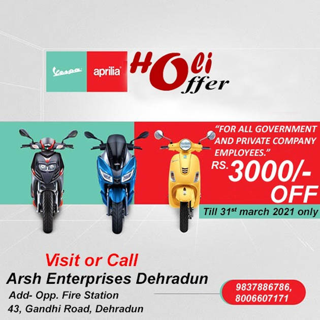 देहरादून। अर्श एंटरटेरप्राइजेस देहरादून वेस्पा व अप्रलिया स्कूटरो पर होली के इस त्यौहार दे रहा है तीन हजार रूपए की छूट। जानकारी देते हुए गांधी रोड फायर स्टेशन के सामने स्थित अर्श एंटरप्राइजेस, वेस्पा व अप्रलिया के डीलर अर्श ने बताया कि इस बार होली पर सभी सरकारी व प्राईवेट कंपनियों में नौकरी करने वालों के लिए वेस्पा व अप्रलिया एक आकर्षक होली ऑफर लेकर आया है। उन्होंने कहा कि वेस्पा-अप्रलिया के सभी स्कूटरों पर पूरे तीन हजार रूपये की छूट दी जा रही है। अर्श ने कहा कि जिस तरह से राजधानी में आबादी बढ़ रही है सड़कों पर ट्रैफिक व पॉलुशन की समस्या भी बढ़ती जा रही है। वेस्पा-अप्रलिया स्कूटरो में थ्रीवॉल इंजन का पॉलुशन लेबल अन्य स्कूटरो के मुकाबले में बहुत कम है। वेस्पा व अप्रलिया से बढ़िया कम पॉलुशन करने वाला दोपहिया वाहन कोई हो नहीं सकता जो वजन में हल्का भी हो और आराम से कितनी भी भीड़-भाड़ वाली जगह में चलाया भी जा सके। अर्श ने बताया कि यह ऑफर कुछ ही दिनों के लिए होली के मौके पर निकाला गया है और इसका फायदा 31 मार्च तक उठाया जा सकता है।